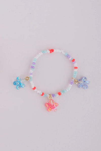 Our Boutique Shimmer Flower bracelet is a cute, delicate, and stylish accessory for any childThis delicate bracelet is made with tiny beads and features 3 flower charms in blue, coral, and purple.