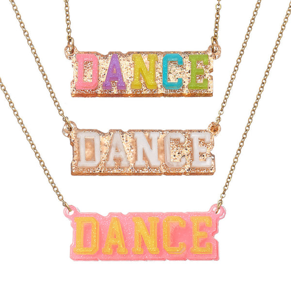 Multi-Color Dance Charm Acrylic Varsity Letter charms on a gold necklace. Adorable Kids Necklaces for Every Style to accessorize any look. One size fits most. Kid-Friendly Necklaces for Everyday Wear. Featuring three different colors to chose from!