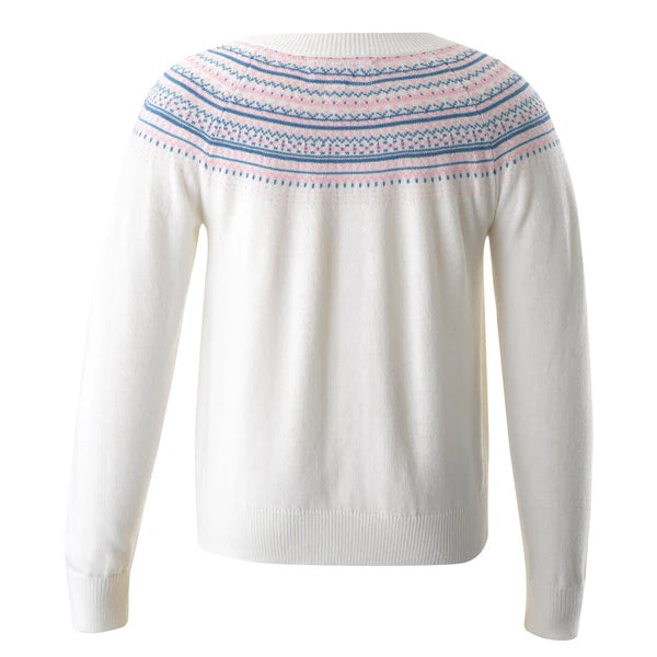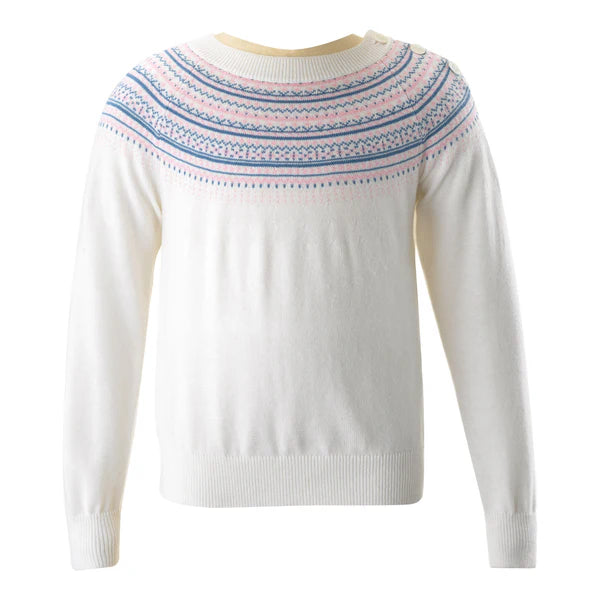 Add an adorable touch to your little girl's wardrobe with our Ivory Fairisle Sweater! This classic fairisle design features charming blue and pink patterns against crisp ivory base. The ribbed neckline and hems provide a cozy fit, while the button opening at the shoulder makes dressing easy. Perfect for any occasion, this sweater is a must-have for your stylish kid.
