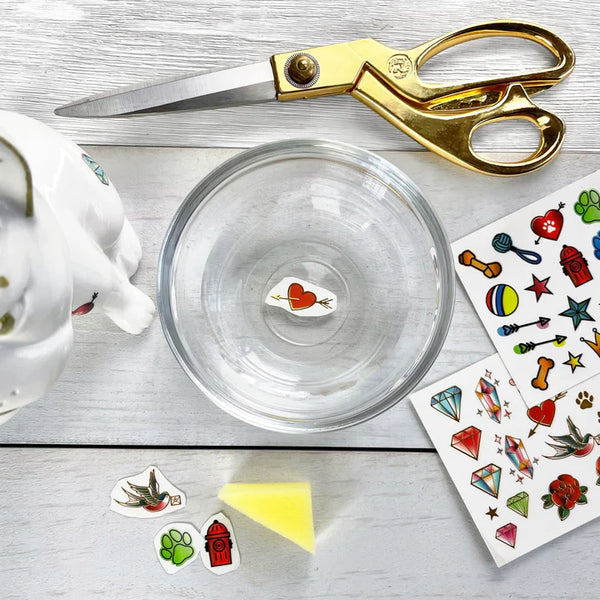 Apply water-decal tattoos & gold designs to an adorable ceramic Frenchie bank. Customize your French sailor dog complete with beret, neckerchief, and funny grimace! The decals have raised line details and have a high-polish, professional finish. Use the gold ceramic marker to add a face and lots of detail. Each one will look totally unique. A great craft for all skill levels!