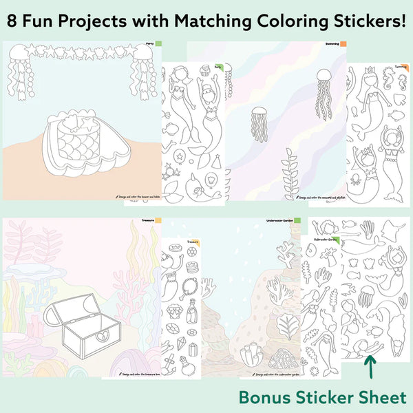 - CREATIVE STORYTELLING KIT: Includes 8 background sheets and 9 coloring sticker sheets for endless mermaid-themed adventures.