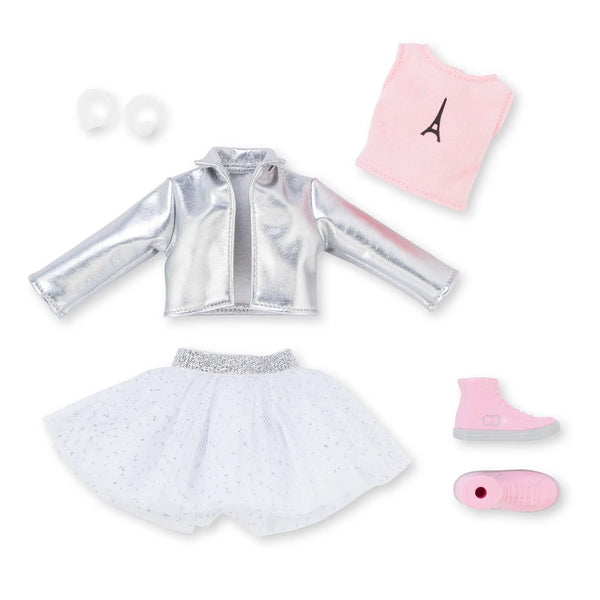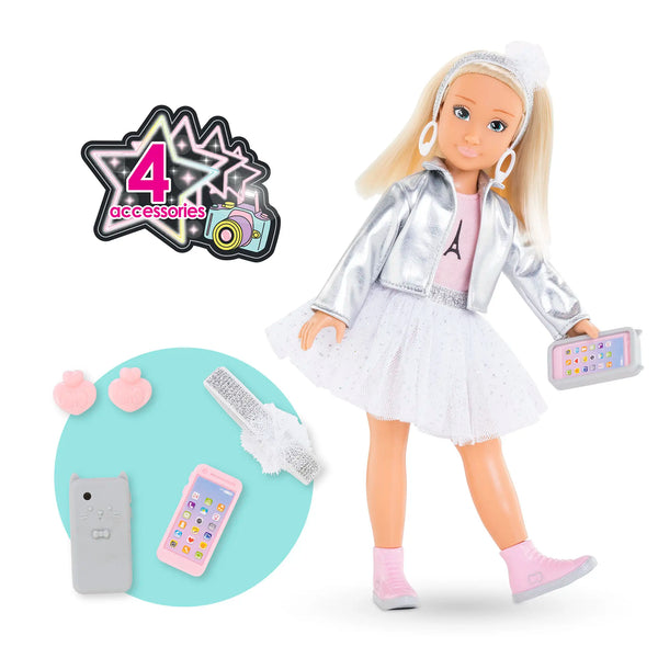 The Valentine Fashion Week Paris set is composed of Valentine, a 28 cm fashion doll, and 4 accessories: 1 pair of removable earrings, 1 mobile phone, 1 mobile phone case and 1 hair band.