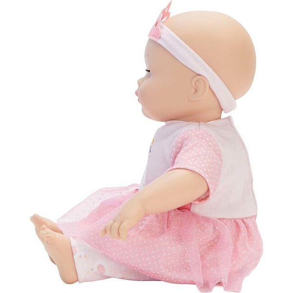 14-inch baby doll babbles over 25 sounds to engage your child! Soft and cuddly doll with molded head/ limbs and soft cloth body. Encourages imaginative, nurturing play through sound. Sound activated by a gentle push of baby's chest. Random assortment of sound means your child will be able to play longer! Sweet face with sleep eyes will charm your child. Quality craftsmanship that demonstrates "love is in the details." Wears a pink tee with swan embroidery and polka-dot sleeves, swan print leggings, and a sparkly tutu. Accessories include a charming felt crown. Doll wipes clean with a damp cloth. Shipped in a window box. Batteries are included and are replaceable.