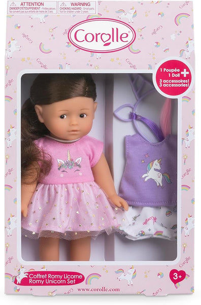 Mini Corolline Romy Unicorn Set is the perfect gift for anyone 3 and up who likes unicorns, which is everyone! The set includes Romy, a petite 8-inch doll in a pink dress with a tulle overskirt sprinkled with gold polka dots and matching molded shoes (not removable), and three accessories: a purple tank top and white shorts with a unicorn print, and a unicorn headband with pink and purple extensions. Mini Corolline Romy has an all-vinyl body that is delicately scented with vanilla -- a Corolle signature, brown painted eyes and long, comb-able brown hair. Romy, Rosy, Rosaly or Ruby -- every child can choose their favorite Mini Corolline or collect them all ! Ages 3 and up.