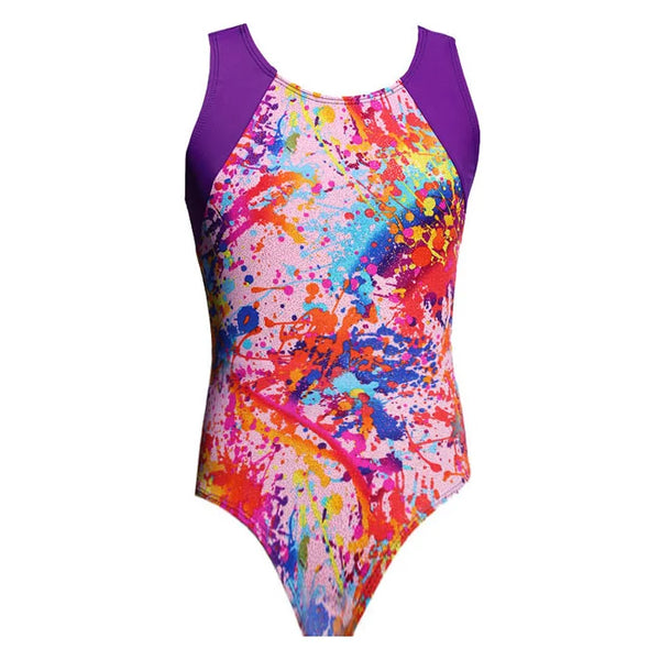 Check out this cute new gymnastics leotard called, Art in Motion. This pink version is colorful and fun to wear to gymnastics practice. It is cut in a t-back gymnastics leotard style and will be comfortable for workouts. The front is sprinkled with pink foil. The top fabric around the arms and back is a purple matte lycra that is very soft and comfortable. The bottom back of the leotard is magenta matte lycra for comfort. A matching gymnastics hair scrunchie is always included.