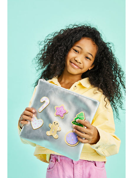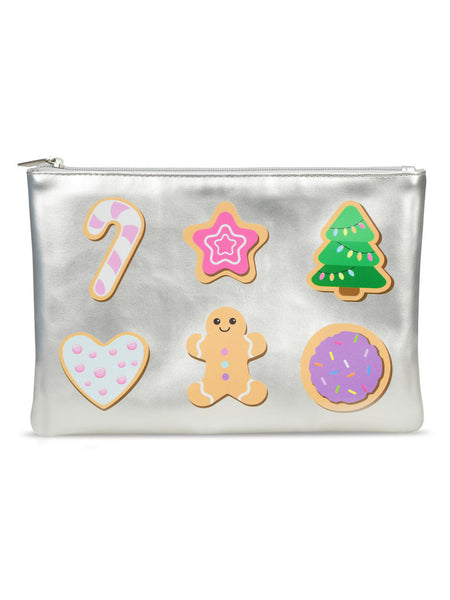 Whimsical cookie sheet embroidery adds pops of color to Iscream's faux leather cosmetic bag.