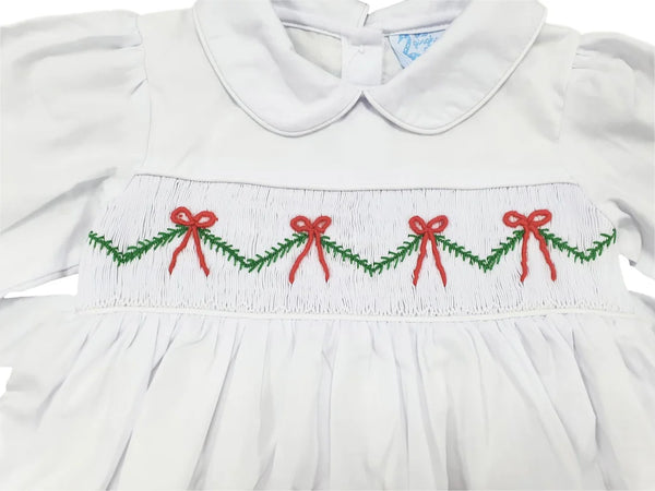 Precious white dress with red bows + green garland smocking across the front. Ties in the back.