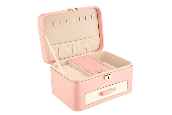 This elegant pink jewelry box offers multiple compartments designed to keep your jewelry collection organized and easily accessible. Its refined design combines practicality with a touch of sophistication, making it a perfect addition to any dressing table. Ideal for storing rings, necklaces, and earrings separately, it helps protect your valuables while enhancing your space with its graceful color and structure.