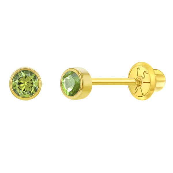 Classic, petite and sparkly, these 14k gold 3mm stud earrings for baby girls are perfect for daily use. Featuring a bright and flawless cubic zirconia stones as simulated birthstones in a bezel setting, these girl's earrings are ideal for ages (0-6 years) as well as older children for accent and second piercings. Crafted entirely of 14k gold, these kid's earrings are suitable for sensitive ears, featuring the very precious material and craftsmanship. The threaded safety screw back design secures them to your child’s ears, making them conducive to the busy and active life of a toddler on the go. These 14k baby earrings make an easy gift choice for a girls birthday month, or if you want to choose their favorite color.