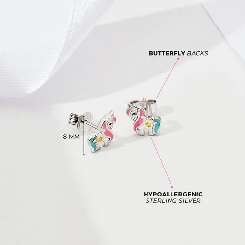 Your little girl will be so happy to receive this gorgeous pair of enamel unicorn stud earrings. The unicorn features a beautiful pink mane and aqua blue tail while a bright yellow star decorates the center of the unicorn.They are made from a hypoallergenic 925 sterling silver and safe for young girls with sensitive ears. A cute, complimentary Window Box is included with these earrings!