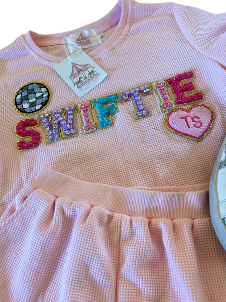 Be the ultimate Swiftie in this cozy 2-piece short set! Made with pink waffle knit for ultimate comfort, it features a playful rhinestone "SWIFTIE" patch across the chest. Perfect for lounging or showing off your love for Taylor in style.
