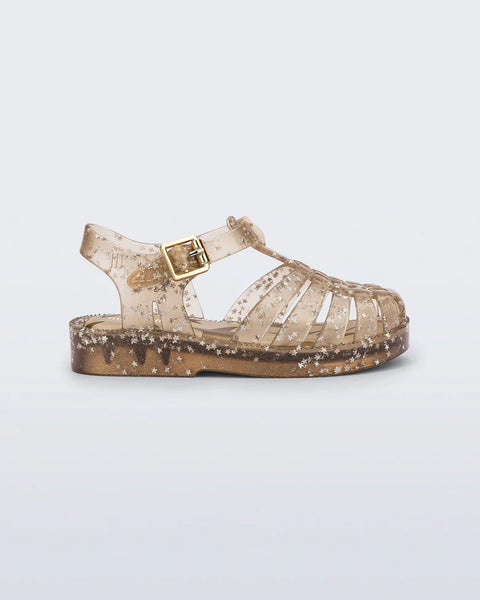 Let your little SHINE. The Mini Melissa Possession Shiny Elements embraces all-out sparkle and star-themed graphics with all the OG jelly sandal features you know and love, like a fisherman-style upper and easy on off ability for all the comfort. Plus, it has a Velcro closure for easy on-and-off for your mini.