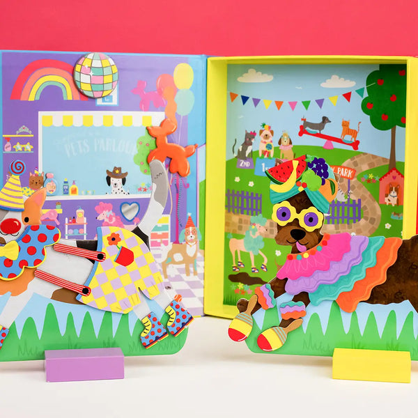 Paw-fect playtime fun with our Magnetic Dress Up Pets! The set comes with 2 magnetic pets - a playful pooch and a super cute cat, two wooden stands and over 90 magnetic outfit and play pieces to mix and match. The reusable box doubles up as a backdrop, with a pets parlour and a fun outdoor play scene. Accessorize the pets parlour by adding magnetic accessories! The lovely reusable box comes with a magnetic closure and keeps all parts safe for next time!