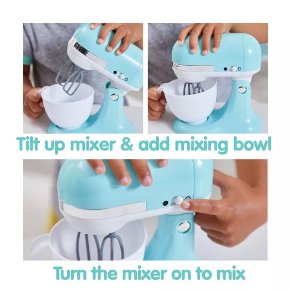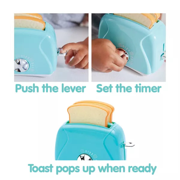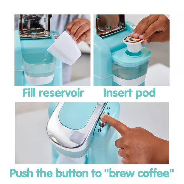 Pretend kitchen play with Coffee Maker, Toaster and Stand Mixer! Fill the reservoir with water, insert pod and push the button to "brew" coffee! Coffee maker makes realistic brewing sounds.