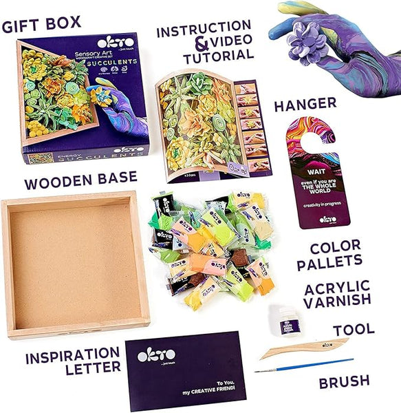 Enjoy your time: Create your personal kind of art. Okto art kits for adults will tap into your feelings and emotions. A pleasant and exciting process of modeling succulents with diverse and colorful air dry clays are waiting for their owner in this craft box. Slow down, relax and marvel at the results with Okto craft set. They reveal the artist in everyone, believe and check!