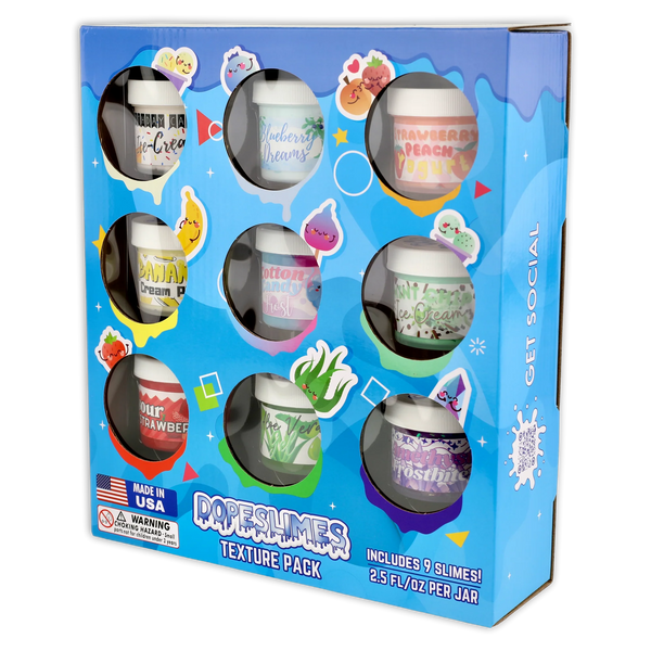 This pack includes nine unique textured 2.5 fl/oz sample size slimes for a total of 22.5 fl/oz of slime:
