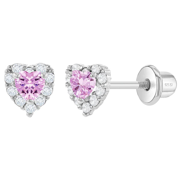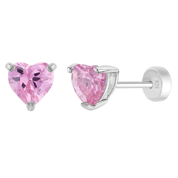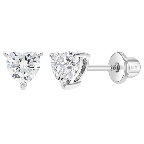 SS Bezel CZ Solitaire Clear Heart Screw Back Earrings