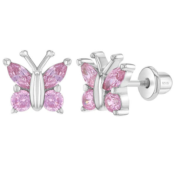 SS Dainty Pink CZ Butterflies Enamel Screw Back Earrings
