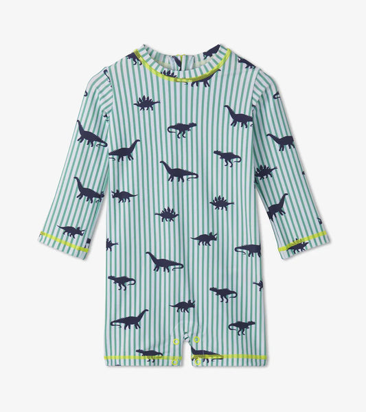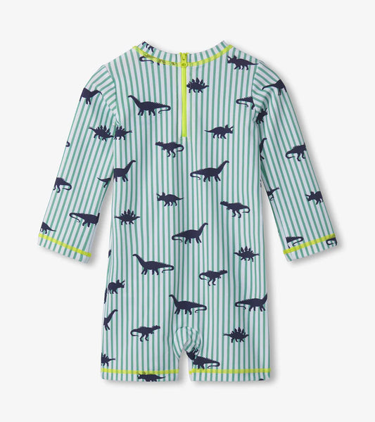 Rawr into summer with the Baby Boys Dino Stripes One-Piece Rashguard! Featuring bold dinosaur stripes, this sun-safe swimwear is perfect for little adventurers. Stretchy, quick-dry fabric makes every splash even more enjoyable.
