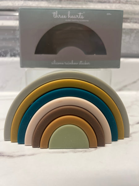 All BPA free silicone stacking toy from Three Hearts. This can be a teether, bath toy, as well as an amazing stacker for the nursery.