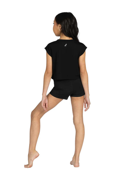 Cropped tee with crewneck and cuffed cap sleeves featuring our popular, I Dance A Latte screen print from seasons past. Polyester/Rayon.