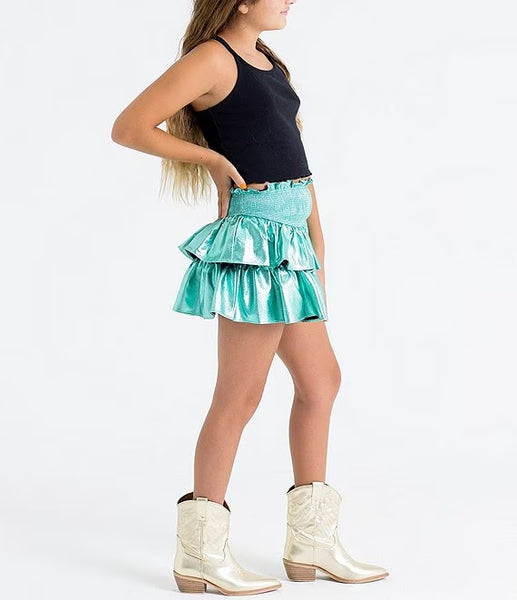 Give your girl’s style a playful twist with the Brookie Skort. The tiered silhouette adds a fun touch, while bright metallic hues dress up any look. With a comfy wide smocked waistband and fully lined privacy short underneath, she’ll be twirling and rocking her day in style. Just add sneakers and a graphic tee for the ultimate playdate look.