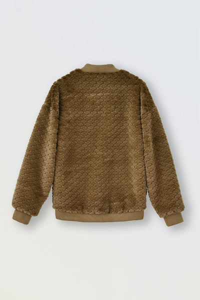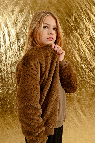 Stay warm and stylish with our Brown Woven Jacket. This teddy style jacket features a textured fur effect and a playful zig-zag pattern. Zip up in the front and keep your hands cozy in the side pockets. The collar, cuffs, and ribbed bottom add unique touches to this oversized jacket. Fully lined for maximum comfort. (Fur real, this jacket is the bear-y best.)