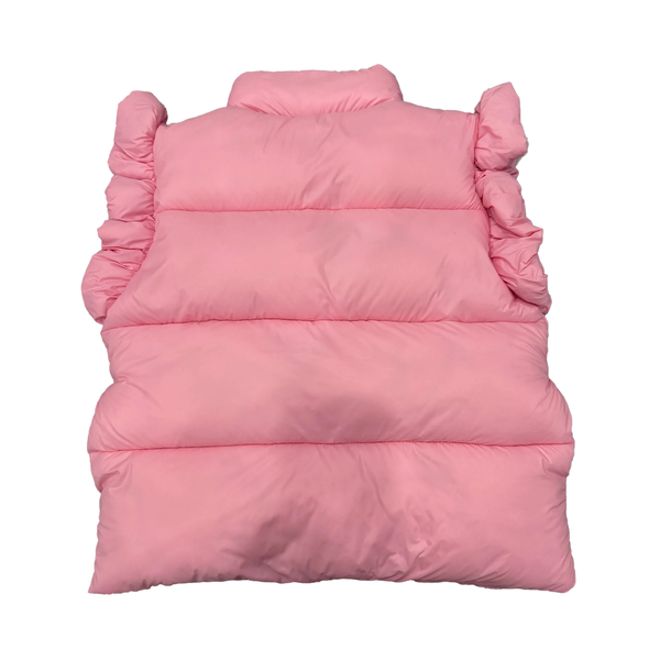 This playful pink puffer vest brings charm with its ruffled sleeves and sweet bow details down the front. Lightweight yet cozy, it adds a flirty touch to your layering game while keeping you comfortably warm. Perfect for those who love to blend fun style with practical comfort.