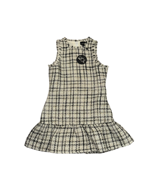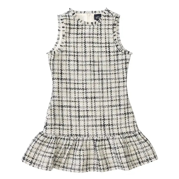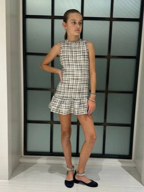 This Little Olin dress brings playful charm with its black, white, and gold tweed fabric and flirty ruffle details. Perfectly tailored for girls ages 6/7 to 14, it combines classic style with a fun, youthful edge that shines at parties or special days out. Comfortable and effortlessly chic, it’s a delightful choice for making every moment a little more magical.