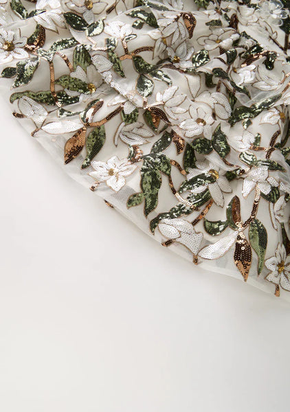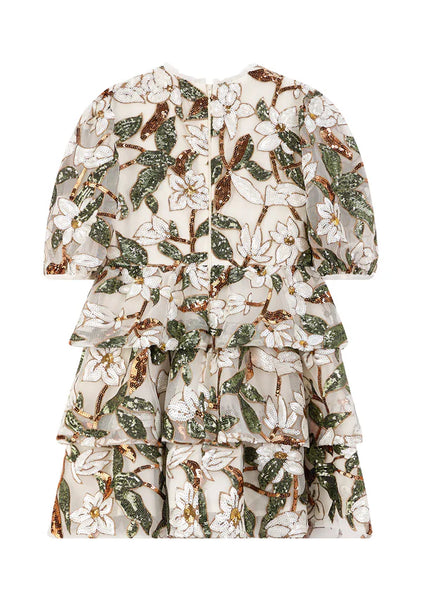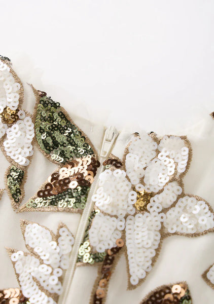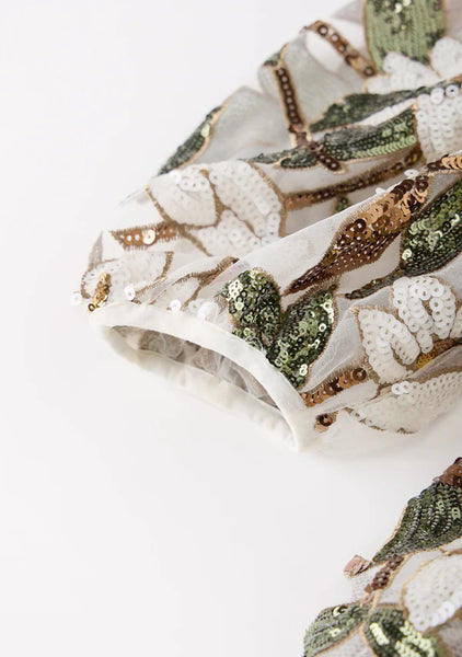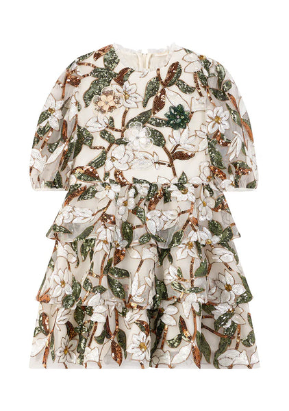 Dazzle and delight in the Maddie Sequin Mini Dress. Featuring floral sparkle and a statement silhouette, it’s the ultimate pick for parties and playdates where twirling is a must.