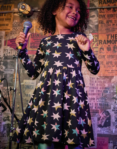 A Tea favorite, this ballet-inspired dress twirls with ease thanks to its circle skirt and fitted bodice. The long sleeves and soft cotton jersey make it an everyday essential, while the vibrant, globally inspired prints add artistry and joy to every outfit. Designed for comfort and movement, it's a style little ones will reach for again and again.