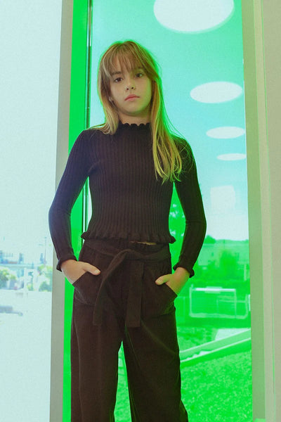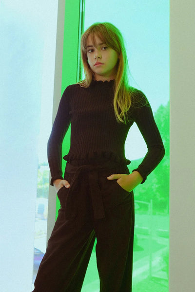 Molly Bracken Black Ribbed Ruffled Knit Sweater