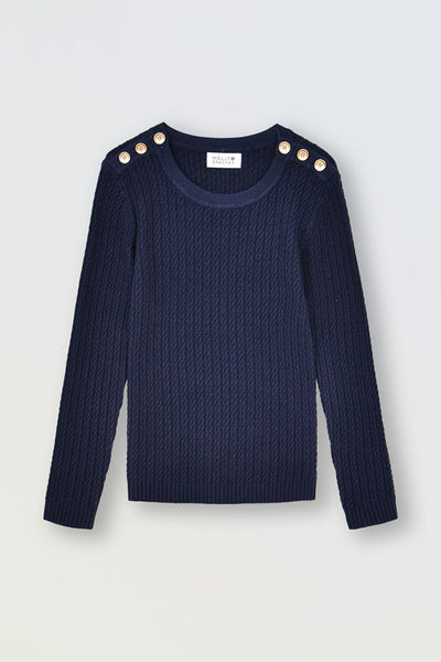 Get ready for Fall with this navy ribbed sweater. With long sleeves and a crewneck, it's perfect for staying cozy. The gold tone buttons on the shoulders add a touch of glam.