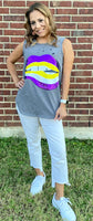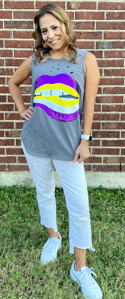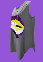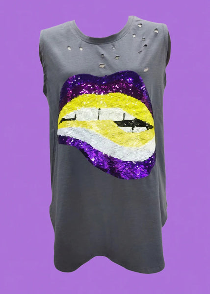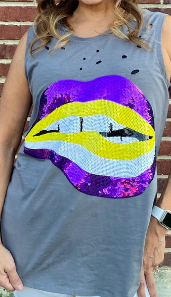 Purple & Gold sequin lips on this distressed tank. Perfect for Game Day or any day you want to support your Tigers!