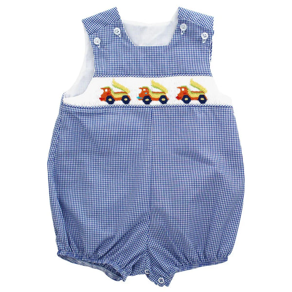 Your little truck lover will adore this whimsical bubble. This classic piece features a roomy cut and a fun embroidered trio of dump trucks that will surely make them giggle. Press buttons at the bottom make diaper breaks extra fast.