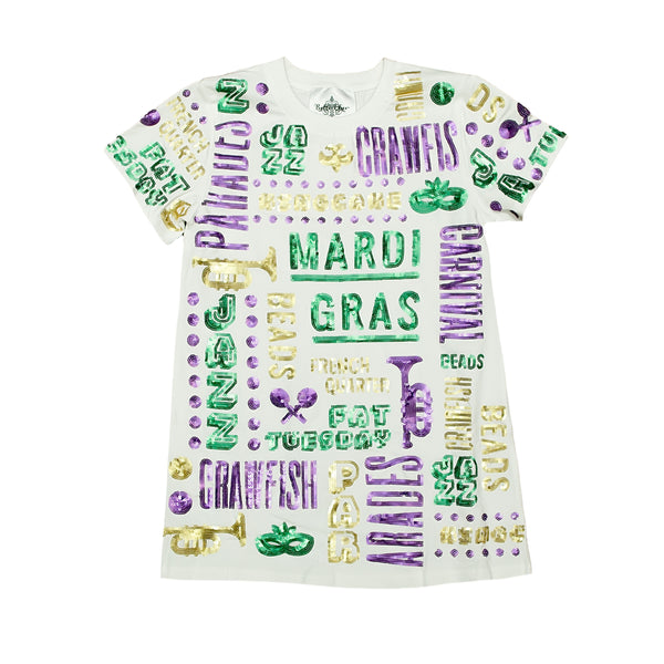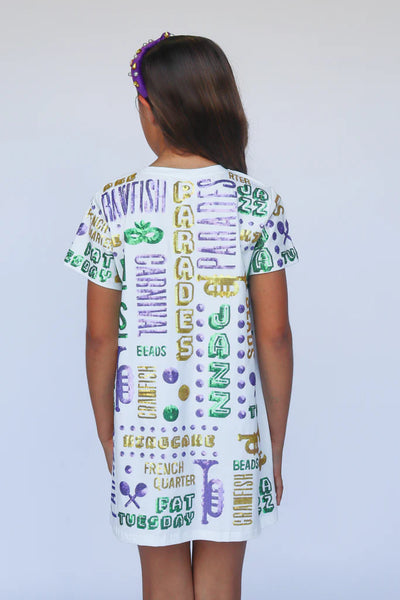 Watch your little one light up the room in this All Things Mardi Gras Sequin Dress! Dazzling head-to-toe sequins catch the light with every twirl, while festive Mardi Gras imagery and playful sayings celebrate the magic of the season. Perfect for parades, parties, or turning everyday moments into sparkly adventures, this show-stopping dress makes every kid feel like royalty. Full sequin coverage means maximum shimmer and endless compliments—because who doesn't love a little extra glitter and joy?
