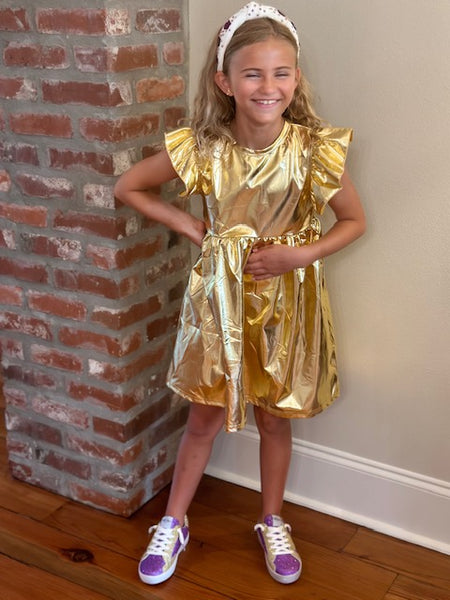 Make a statement this season with the Belle Cher Gold Metallic Dress! Featuring gold metallic fabric and a flutter sleeve, this dress will have you looking and feeling like a million bucks (without the price tag)! Ready for any occasion, this dress is sure to sparkle and shine.