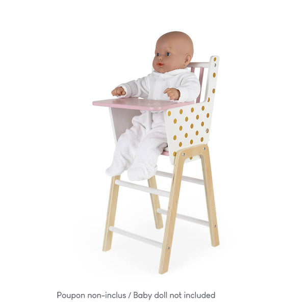 It's doll feeding time! Comfortably settle a doll in this beautiful highchair, decorated in gorgeous white, pink and gold colors! Children aged 3 years and up will love inventing stories with their favorite dolls, thanks to this ultra-realistic, sturdy wooden highchair. The sides of the chair sparkle, thanks to the pretty glittery golden polka dots, typical of the Candy Chic range.