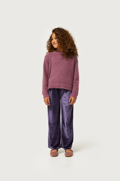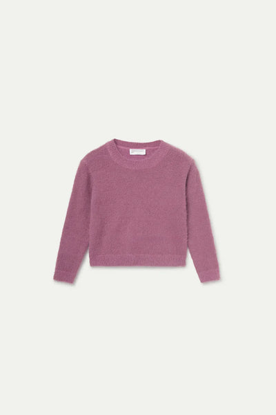 Girl's purple fur-effect knit sweater. With a round neck and long sleeves. Elastic cuff detail. The model is 140 cm tall and wears size 8.