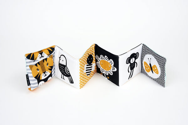 Follow Tiger as he creeps through the jungle on an adventure. Whether you and your baby are at home or on the move, these are the ideal first soft cloth books for cot or pram play. Beautiful colorful artwork is printed on one side, and when flipped over a stunning illustrated narrative is revealed in bold line. Research has indicated that newborn babies love high-contrast images and respond well to them. This adorable series from Wee Gallery features bold illustrations along with simple words to help babies develop their vision and language skills. For added sensory effect, these soft cloth books also come with fascinating crinkle sounds.