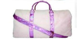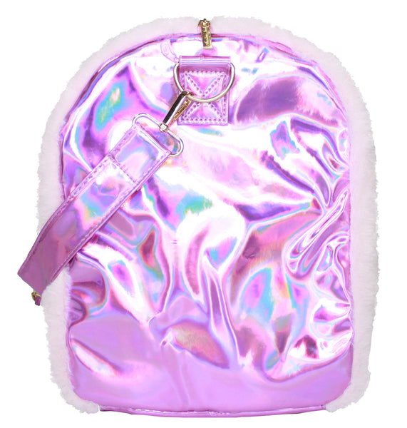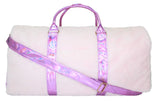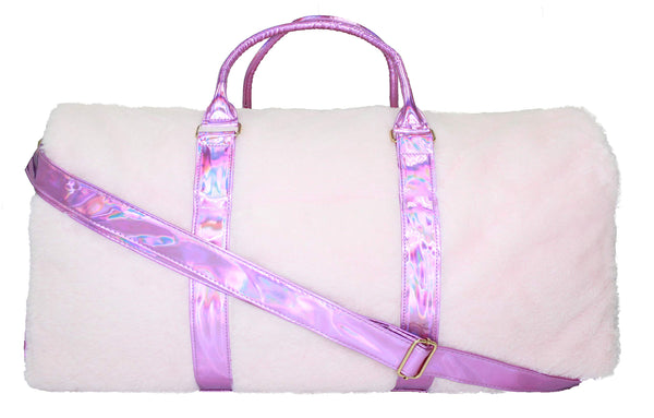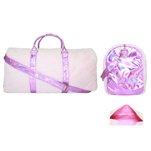 The Pink Faux Fur Travel Bag by American Jewel is a spacious, 24x12x9 inch furry tote featuring purple iridescent shiny straps and playful glitter accents. Designed to combine practicality with whimsical style, it’s perfect for travel, dance, school, or sleepovers—making every outing a statement of youthful charm and vibrant personality.