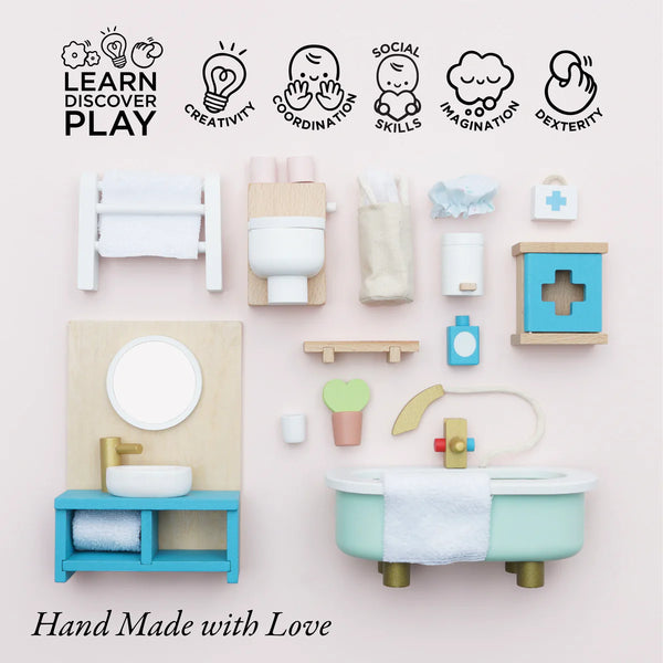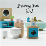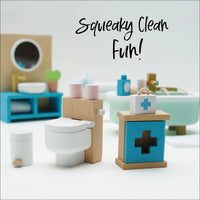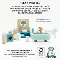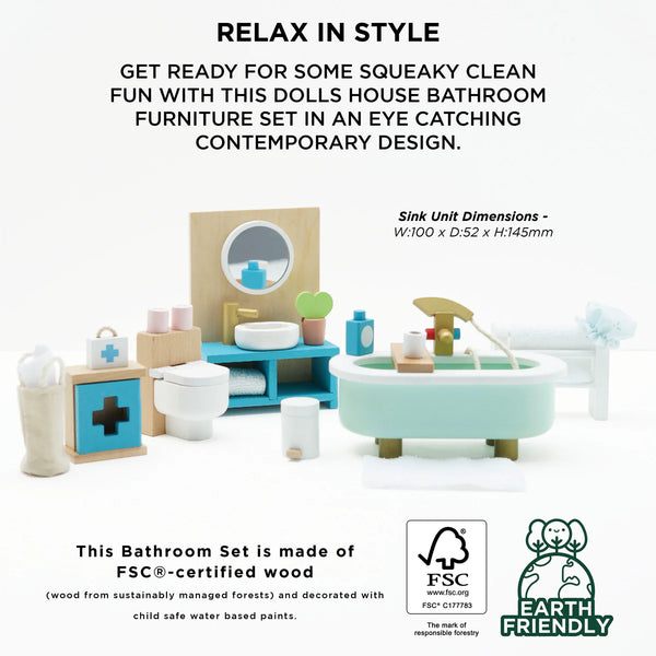 Get ready for some squeaky clean fun with this dolls house bathroom furniture set in an eye catching contemporary design. Featuring a beautiful freestanding bath, towel rail, toilet, sink unit plus a first aid cupboard and an assortment of accessories, little residents will scrub up a treat.