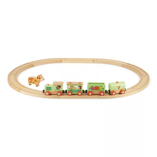 Choo-choo! All aboard the express train to the farm! Your child will be able to have fun around the world of the farm with this pretty magnetic wooden train in soft colours. It’s up to him to make the familiar countryside animals, and the characters already installed in the wagons, go on a journey. The circuit is to be built using 10 wooden rails (compatible with existing rails on the market), 2 shapes are possible: an oval circuit and a round one. The wooden train can be formed and unformed thanks to a system of magnets fixed on each of the 3 carriages and on the engine. The wooden cow is removable and can equally be used for playing outside the train. This essential game for children from 3 years old will develop your child's imagination and fine motor skills.