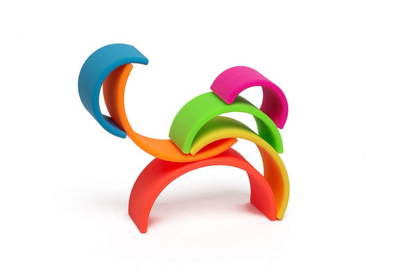 This 6-piece Neon Rainbow is a teether and playmate, all in one. Thanks to its soft material and its gorgeous design, your little one will spend the day experimenting, playing and chewing safely. With dena, her first toy is very fun, very safe and very useful for psychomotor development.