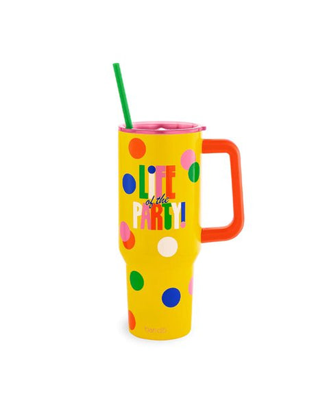 For serious hydration fans only! This stainless steel tumbler has an oversized design, handy handle, and flexible plastic straw.