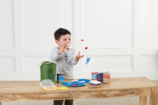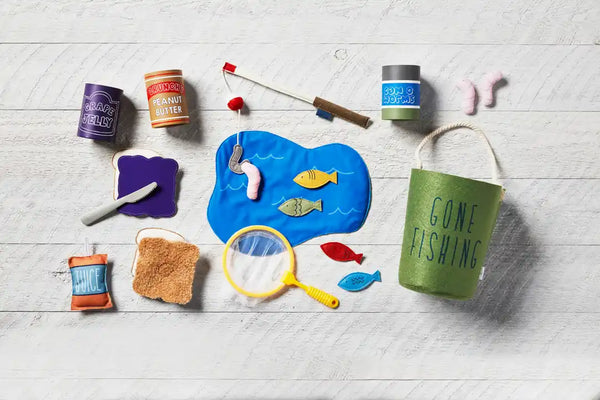 Reel in a big fish with our My Fishing Play Set. The 20 piece set comes with a felt fishing bucket that comes packed with play pond. The set also includes a magnetic fishing pole, three magnet fish, a can of worms with three magnet worms, and a net. For lunch, we've packed a play juice box, sandwich, peanut butter and jelly jars and a knife. This set comes gift bagged win the felt fishing bucket. This set is intended for ages 3+. We love this as a birthday gift for your adventure buddy!