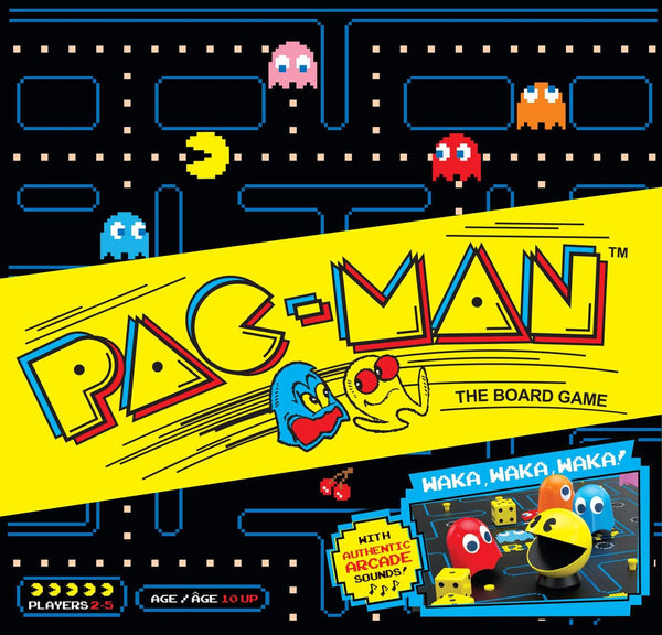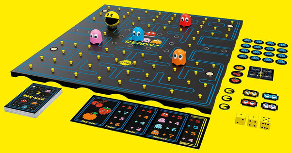 PAC-MAN - The Board Game Rediscover the arcade classic all over again! Master the maze, beat the ghosts, get your initials by the high score! Stay alert, move quick, and be smart. Gulp down power pellets and eat the ghosts for extra points in this collaborative and competitive game. Game contains 1 maze game board (4 parts), 1 electronic PAC-MAN pawn, 4 ghost pawns, 35 level 1 ghost cards, 5 level 2 ghost cards, 3 yellow PAC-MAN dice, 4 ghost eyes tokens, 4 power pellet tokens, 16 blue ghost tokens, 3 fruit tokens, 3 PAC-MAN life tokens, 4 scoring pieces, 1 high score note pad.
