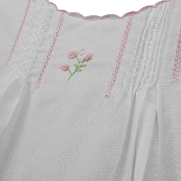 Featuring heirloom-quality handcrafted details like pintucks and open work embroidery, this piece is sure to become a treasured keepsake. A simple yet sweet embroidered flower design and a scalloped edge adds the perfect finishing touch.
