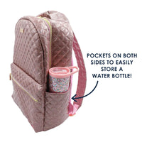 Bigger is better thanks to this oversized glitter coated, quilted backpack designed with someone on-the-go in mind! The bow shaped handle makes this a can't miss whether you're headed back to school or looking for a way to brighten your travel days or commute. This heavy-duty backpack comes with adjustable straps, side pockets to hold a water bottle or other accessories, a front pocket, and with luxe gold hardware too - what's not to love?