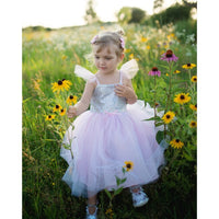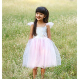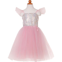 Elegant Silver Sequins Princess Dress featuring dazzling sequined top adorned with iridescent sequins sewn into light pink stretchy lining. The layered skirt is topped with iridescent glitter tulle for that perfectly adorable look! The straps are made with stretchy spandex and feature shimmering tulle puffs. A small satin bow detail sewn into the elasticized waistband finishes this glamorous princess dress with a world touch of class!